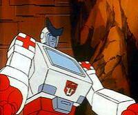 Ratchet was the best tool-and-die man on Cybertron. In his work bay on Earth he can make anything from a pin to a missile. Repairs injured Autobots, given the right parts. Likes to party, give backtalk, but does any job as well as anyone. Has laser scalpels, arc-welders, electron microscopes, circuit sensors, fluid dispensers at his disposal. Sometimes his having a good time interferes with his effectiveness.